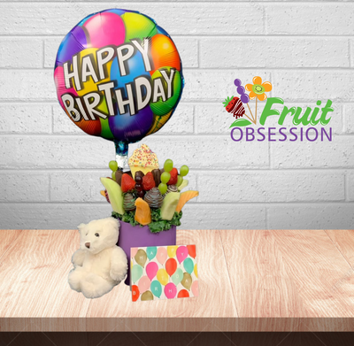 Birthdays can be hard to buy for...every person we know seems to have a birthday at least once a year! Our creative staff have put together our complete Birthday Bash Package to help celebrate anyone's special day. The package includes a Happy Birthday Balloon, a Hand-Written Birthday Card, one of our Berry stuffed animals and a Dazzle size bouquet. Other variations and sizes are available below. The Birthday Bash Bouquet includes a Lindt white chocolate pineapple cupcake centre, surrounded by semi-sweet chocolate dipped strawberries with bright festive drizzle. We also include melons, grapes and some dipped granny smith apple slices too!