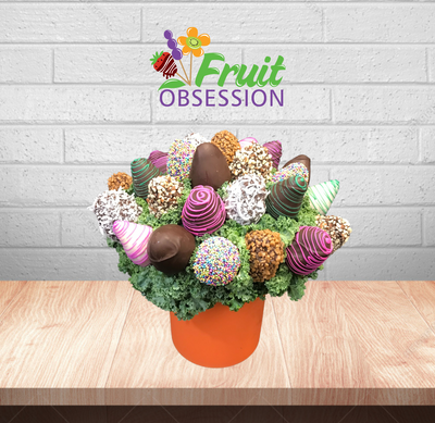 Inspired by our extremely popular Strawberry Sensation gourmet box, we're excited to introduce our new bouquet version! We have combined all of our favourite toppings, added them to our succulent chocolate dip strawberries, and made this sensational and eye catching bouquet. Our fresh and delicious strawberries were dipped in semi-sweet chocolate and Lindt white chocolate to set the tasty background for our incredible toppings such as caramel bits, almonds, coconut and more! This bouquet comes in two sizes and will brighten up any table, event, or be the perfect treat for someone's special day.