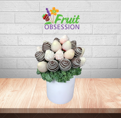 Tired of seeing the same old wedding centrepieces? This fruit bouquet is designed as the perfect way to elevate any wedding reception or wedding-related event. It's creative, beautiful and delicious. Enjoy our juicy, plump strawberries coated in various combinations of our semi-sweet chocolate and white chocolate along with chocolate drizzle and coconut for added visual appeal and taste.