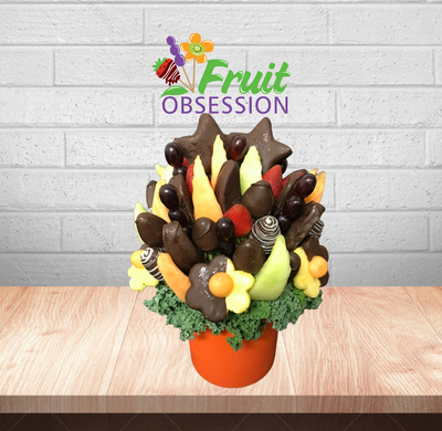 Half dipped, but fully delicious! This incredible fruit bouquet combines some of our favourite dipped chocolate fruit in our semi-sweet chocolate. The big, juicy and fully dipped pineapple stars are amazing and so is our white chocolate drizzle. Looking to say Thank You, Get Well, Congratulations, Happy Birthday or I Love You...look no further.