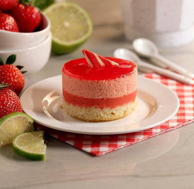 A fluffy vanilla cake base, layers of strawberry-lime cream, and strawberry-lime mousse, covered with a luscious strawberry glaze. Finished with a white chocolate wafer.