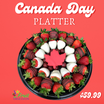 Nothing goes together like backyard BBQs, cold drinks, fireworks and chocolate dipped fruit! Trust us, we've tried it! Add a new flash of red and white this Canada Day with our gorgeous Canada Eh! Platter. This shareable platter celebrates all this Canada with multiple combinations of our delicious, dipped and natural strawberries. A gourmet dipped pineapple Maple Leaf sits atop a bed of fresh grapes to top of this show-stopper.